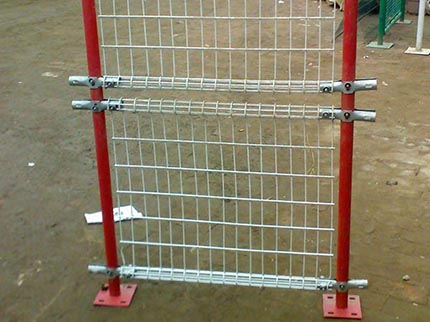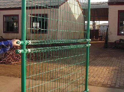 双圈护栏网是用冷拔低碳钢丝焊接成网筒状卷边与网面一体,采用镀锌进行防腐处理,具有很强的耐腐蚀性,然后进行喷、浸塑,各种颜色的喷、浸塑;最后连接附件与钢管支柱固定。
