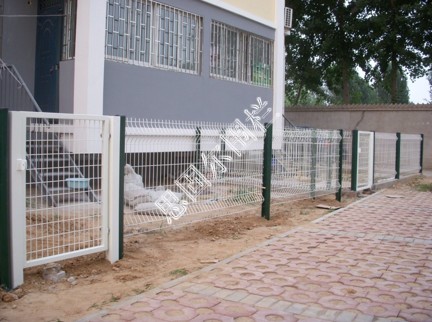 铁丝网小区围栏是由排焊机对铁丝焊接成型,在经过折弯、表面处理,立柱制作,安装后形成。