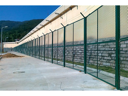监狱围栏主要是采用高强度的刀片刺网与普通防护网的结合,由V型支架立拄,加强型焊接片网,安全防盗连接件和刀片刺网组成.刀片刺网是一种新型防护网,由锐利尖角镀锌钢板或不锈钢薄板做刀片,钢丝做芯线组合而成的防护器材。