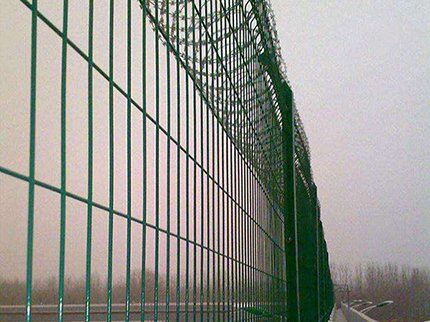 注:如果在机场隔离网顶部加装刀片刺丝、刀片刺绳后又很好的增强了安全防护性能。采用电镀、热镀、喷塑、浸塑等防腐形式,具有很好的抗老化、抗晒、耐候等特点。其产品造型美观、花色多样,既起到围栏作用,又起到美化作用。由于具有安全性高、防攀爬能力好,网片连接方式采用特制SBS紧扣件,有效防止人为的破坏性拆卸,横向四道折弯加强筋,使网面强度显著增加。